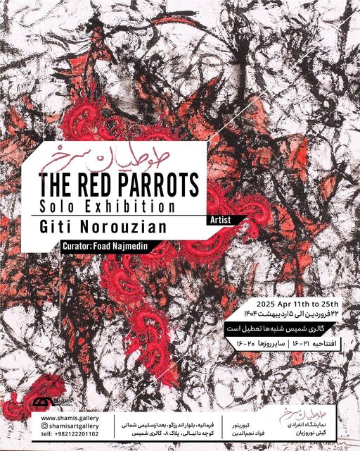 نمایشگاه انفرادی «طوطیان سرخ» از گیتی نوروزیان با گردآوری فواد نجم الدین از امروز تا پنجشنبه چهارم اردیبهشت در گالری «شمیس» واقع در فرمانیه بلوار اندرزگو خیابان دانیالی شماره ۸ برپا خواهد بود.